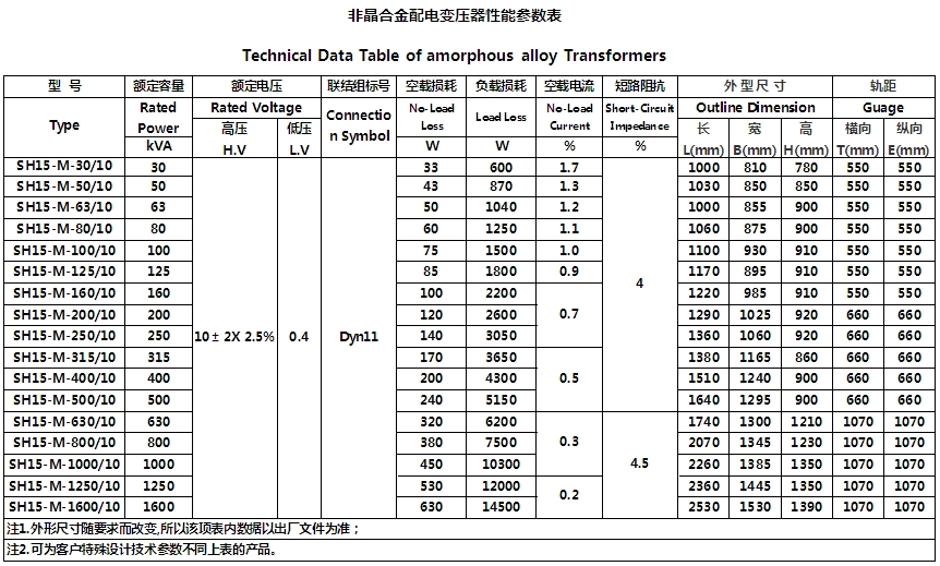 华盈公司SH15系列(10kV级) 三相油浸式非晶合金变压器技术参数: